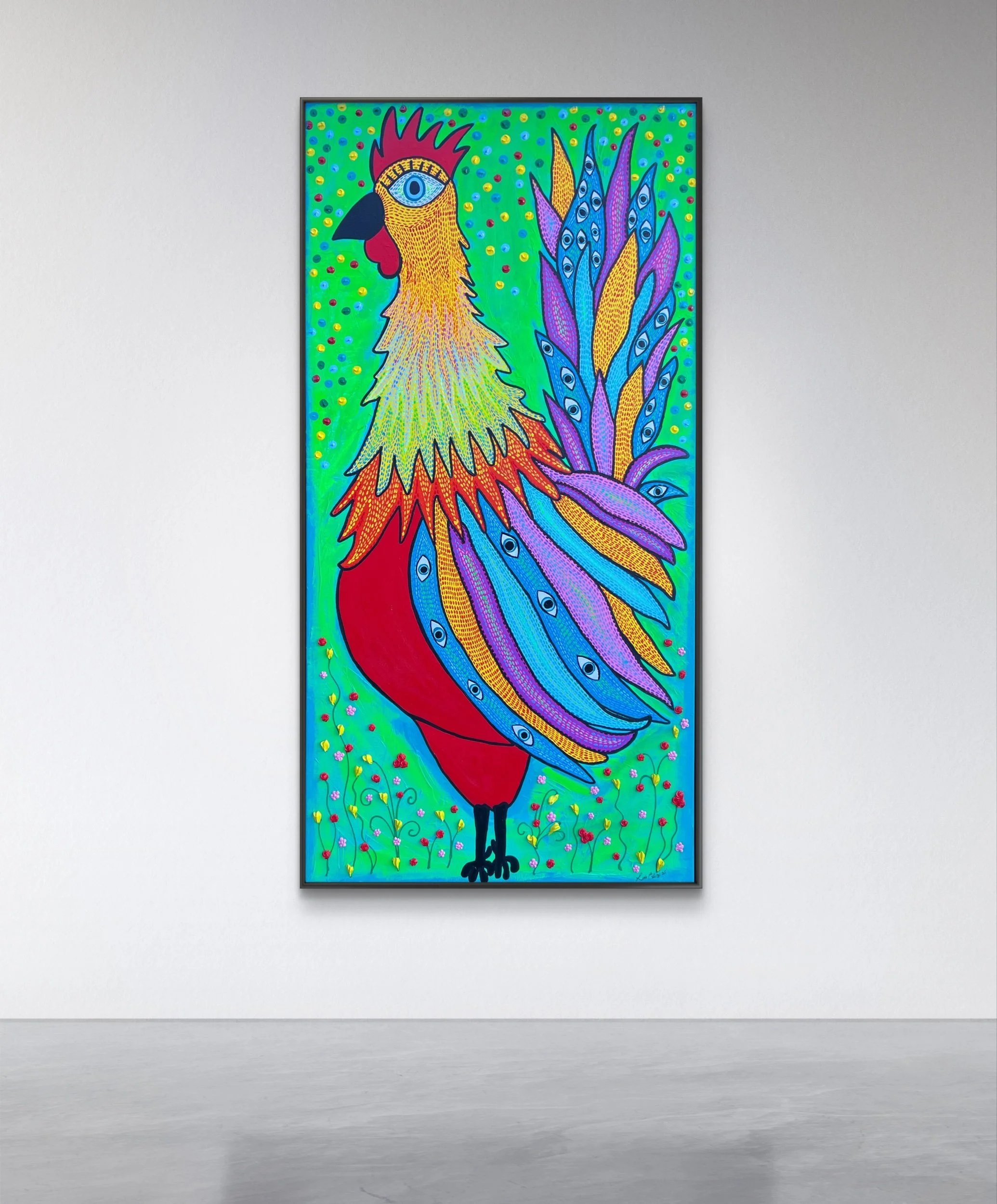 A rooster so fabulous it should cost $5M!!! He didn’t come to impress — he came to be the moment and own the gallery.